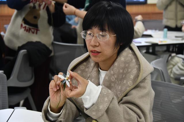 听完课程之后,老师们开始踊跃地动手制作作品。每一个人都沉浸其中,享受着创作的乐趣。大家先按步骤指引将花瓣用丝线缠绕在一起,再用各色的丝线缠绕成叶片,最后将花瓣与叶片组合在一起,一支栩栩如生的缠花胸针、缠花发夹就做好了。当看到自己亲手缠出的作品时,大家脸上洋溢着自豪与喜悦。 此次活动为女老师们提供了一个放松身心、展示自我的平台,更让非遗文化在互动体验中得到传承与发扬,为节日增添了一抹浓厚的文化底蕴。未来,行政部门分工会将举办更多丰富多彩的文化活动,让大家感受工会小家的温暖,也能在工作之余愉悦身心,提振精神 。